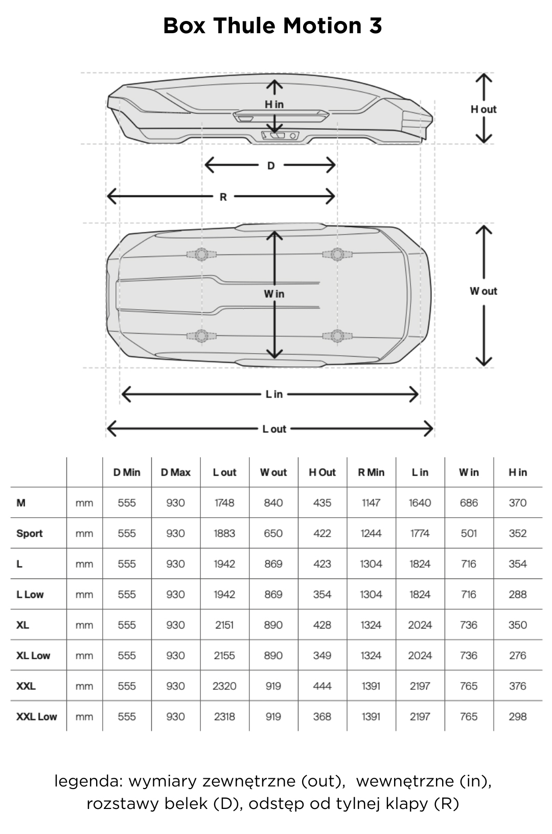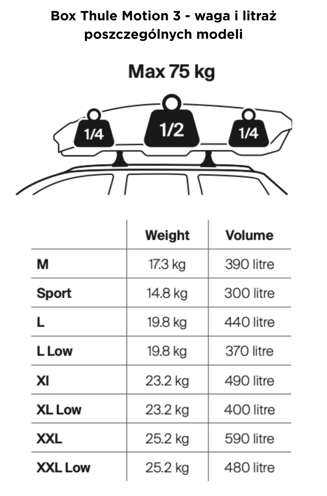 - Poniżej waga, litraż i wymiary poszczególnych boxów Motion 3