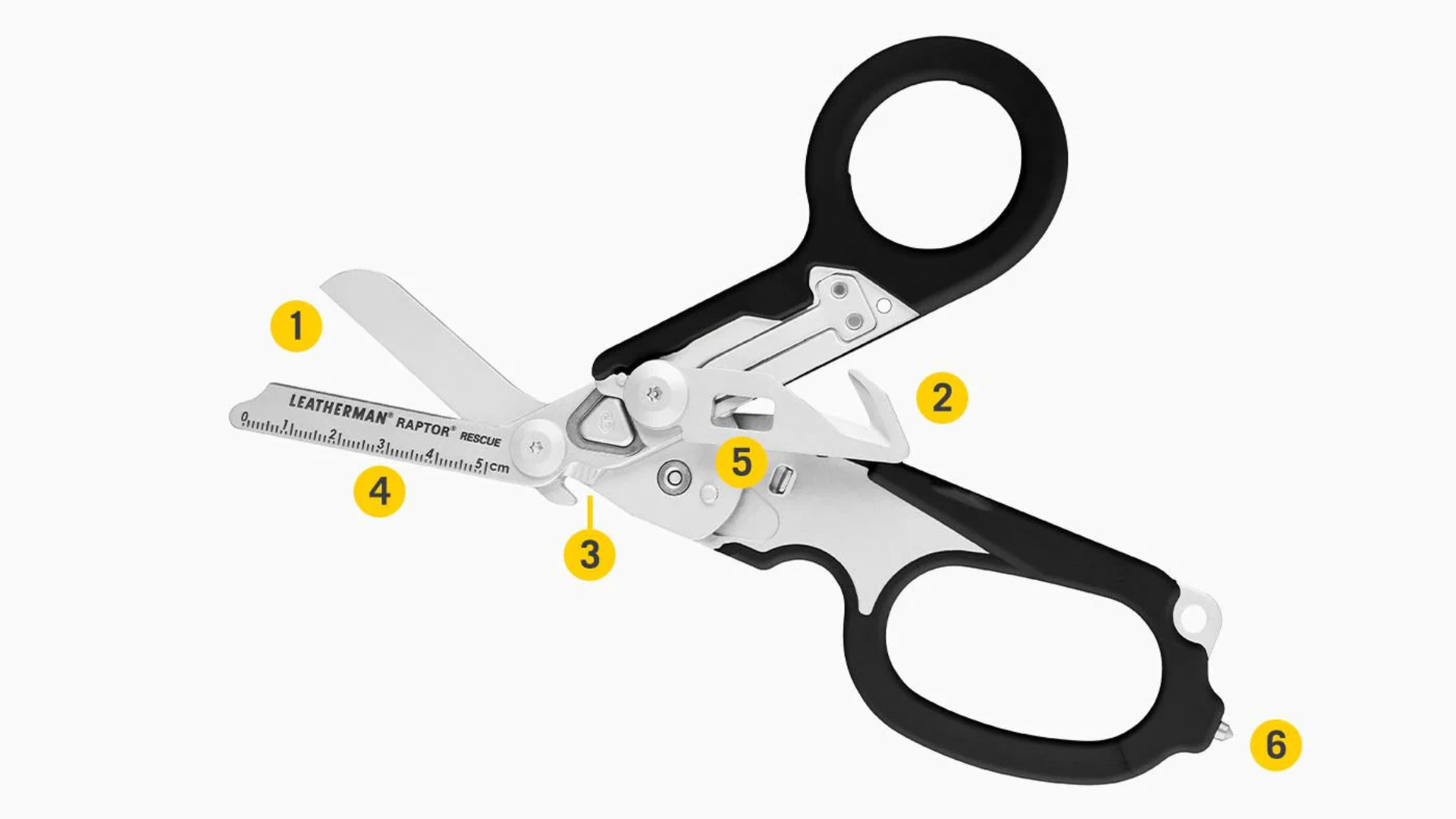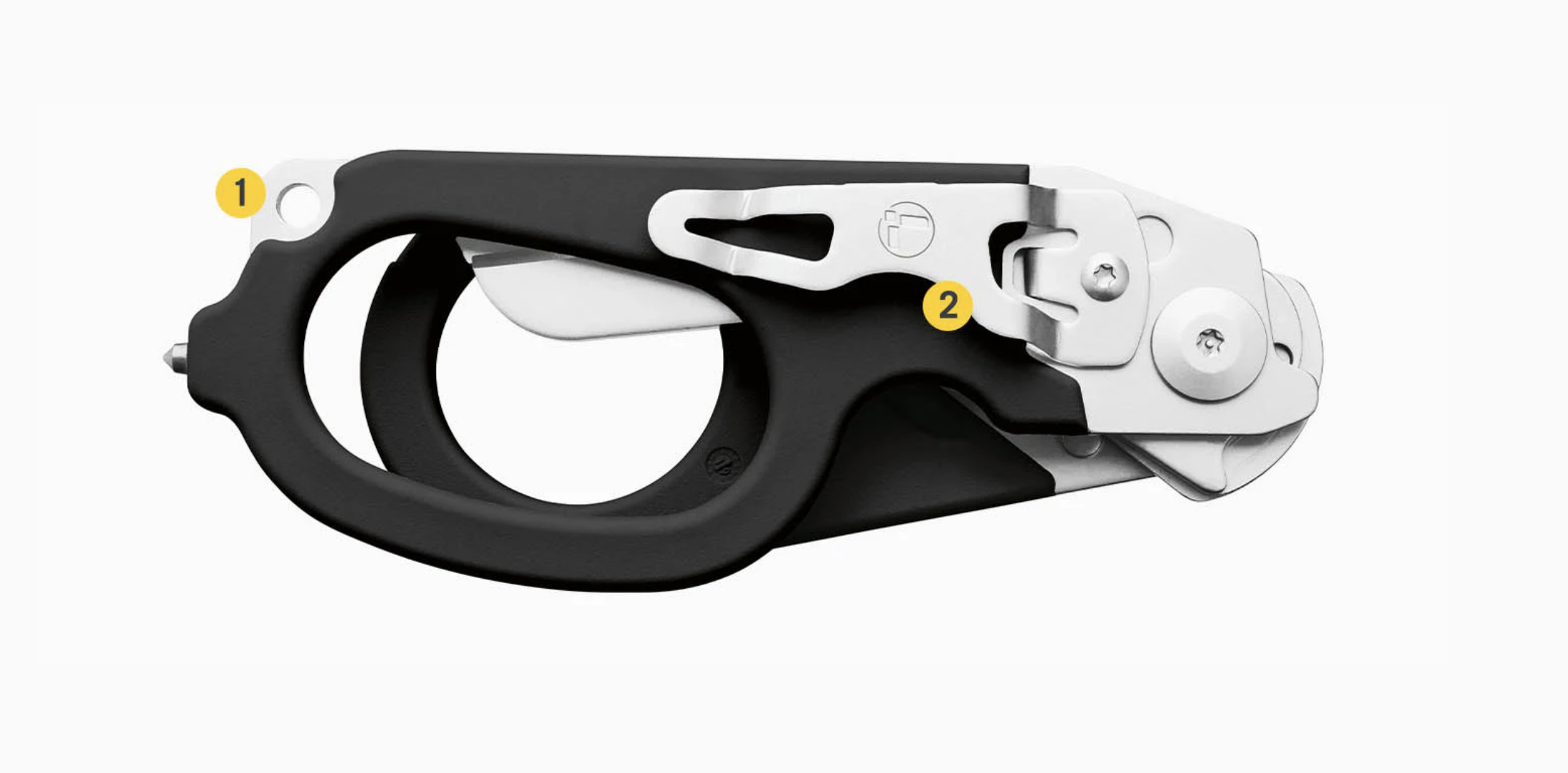 Te składane nożyce, zaprojektowane z myślą o rzeczywistej pomocy w nagłych wypadkach, łączą w sobie pięć podstawowych narzędzi: nożyczki klasy premium, przecinak do pasów, przecinak do pierścionków, klucz do butli z tlenem i zbijak do szyb. Narzędzie Raptor Rescue składa się w celu łatwego przenoszenia. Dołączono do niego funkcjonalną kaburę, która zapewnia szybki dostęp w krytycznych momentach.