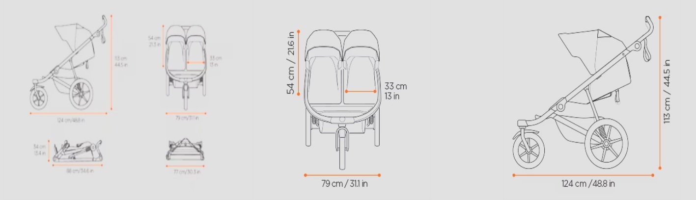 Praktyczność to nie jedyna zaleta tego wózka. Składa się jedną ręką do niewielkich rozmiarów, co bardzo ułatwia przechowywanie i transport. Daszek całkowicie zasłaniający dziecko przy zachowaniu swobodnej wentylacji zapewnia dzieciom komfort w każdej sytuacji, jaka się może przydarzyć w ciągu dnia. Wysokiej klasy rozwiązania, takie jak pompowane opony i duża przestrzeń bagażowa czynią z tego podwójnego wózka na każdy teren idealne akcesorium dla każdej powiększającej się rodziny.